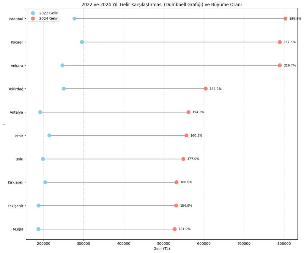 Yıllık kişi başına geliri en yüksek 10 ile bakıldığında ise kişi başına milli gelirde salgın sonrası 2022 ile 2024 yılları arasında en büyük büyümenin Ankara’da kaydedildiği görülürken, diğer yüksek gelirli illerin hepsinde iki yılda %138 seviyesinde gerçekleşen fiyat artışlarının üzerinde kişi başına milli gelir büyümesi izlendi. Aşağıdaki grafikte pembe noktalar 2024 gelirlerini gösterirken, maviler 2022 kişi başına gelirlerine denk gelmektedir. Yüzdelik artışlar iki sene içerisinde toplam artış oranını gösterir.