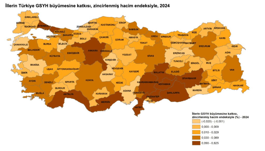 Öte yandan illerin %3,3 olarak gerçekleşen Türkiye’nin 2024 yılı büyümesine katkılarına bakıldığında 0,62 puanlık büyümenin İstanbul tarafından karşılandığı görüldü. İstanbul’u 0,44 puanlık katkı ile Ankara izlerken, 2023 yılında yaşanan büyük deprem felaketinin etkisinin ardından geçen ilk senede, bölgedeki illerin her biri 0,10 puanın üzerinde büyümeye katkı yaptı.