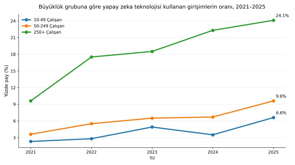Girişimlerin son beş sene içerisinde yapay zeka teknolojisi kullanma oranlarına bakıldığında özellikle 250 ve üzeri kişinin çalıştığı girişimlerde neredeyse %25 seviyesine ulaşıldığı görülmektedir. Bu rakam beş yıl önce %9’lar seviyesinde idi. Salgının etkilerinin geçmesi sonrası kurumsal şirketlerde hızlı bir yapay zeka dönüşümü olduğunu görüyoruz.