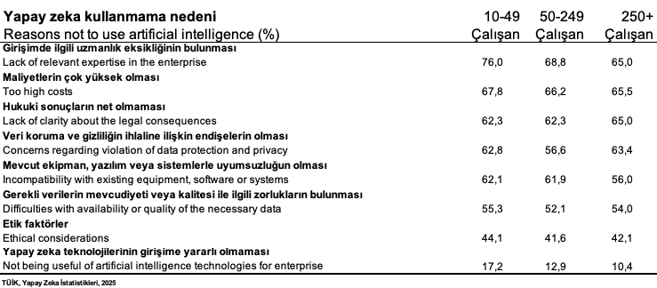 Ülkemizdeki bütün girişimler dikkate alındığında, 2025 yılında yapay zeka kullanımı oranı %7.5’ta kaldı.