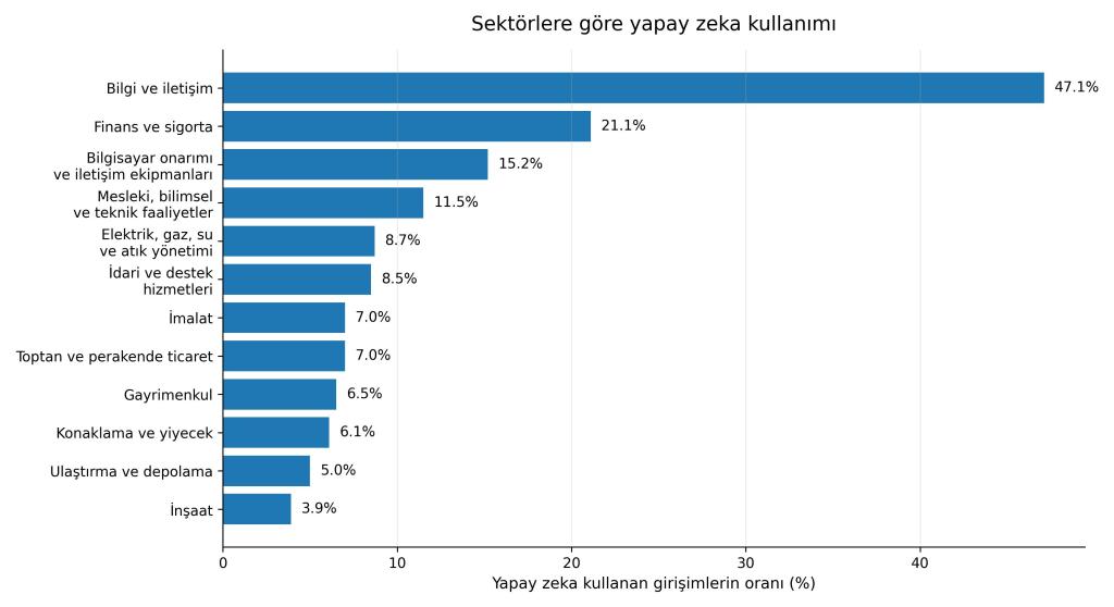 Sektörler detayında, bilgi ve iletişim sektörlerinde faaliyet gösteren kurumların %47.1’inde yapay zeka kullanıldığı görülüyor. Yapay zeka teknolojilerinin dayandığı eko-sistemdeki girişimlerin çoğunun burada faaliyet göstermesi nedeniyle, bilgi teknolojileri sektörünün açık ara liderliği beklenen bir olgu.