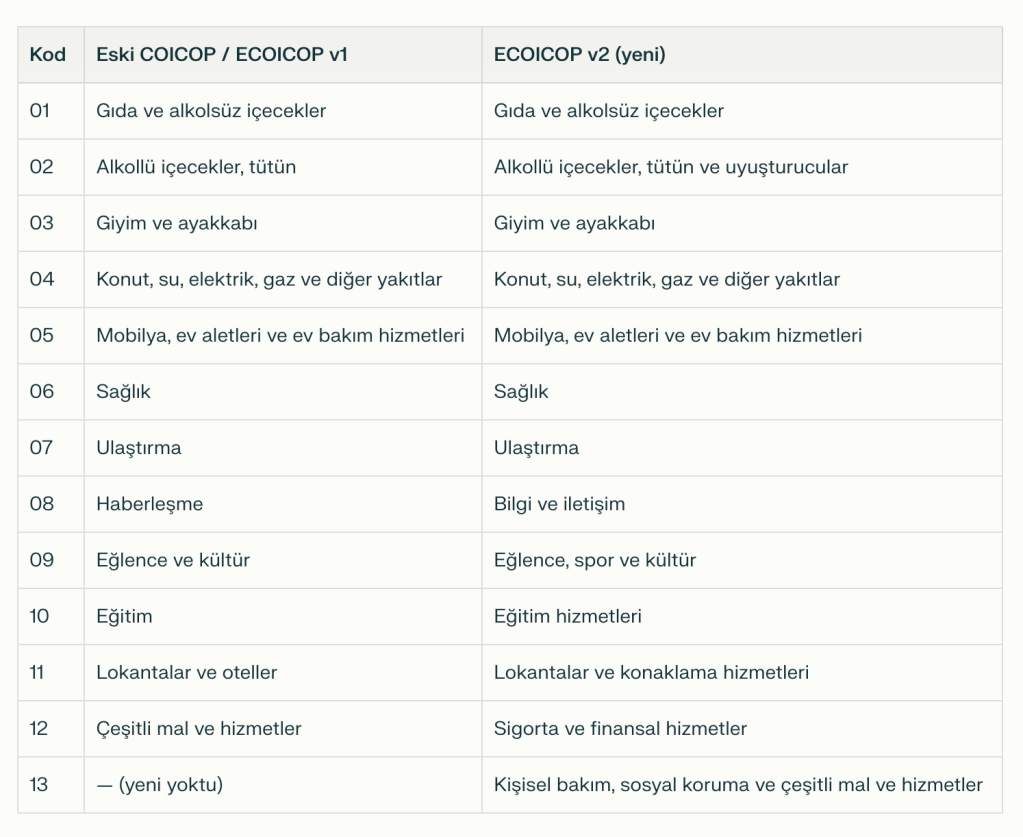 Perplexity Yapay Zeka Sistemi’nin benim için hazırladığı aşağıdaki tablodan görüldüğü gibi “sigorta ve finansal hizmetler” ve “Kişisel Bakım – Sosyal Koruma” için yeni ana endeksler ortaya çıkarken, artık çok demode kalmış “Haberleşme” isimli alt grup, “Bilgi – İletişim” şeklinde kurgulanıyor. Yeni oluşan “Bilgi ve İletişim” grubu altında, “Haberleşme Hizmetlerinin” yanı sıra, “Bilgi ve İletişim” ekipmanlarının fiyatlarının da bir grup olarak takip edilmesi mümkün olacak.